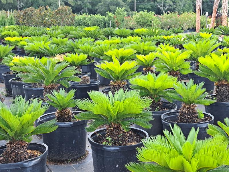 This palm-like plant features a striking crown of dark green, feathery leaves that gracefully arch outward. The Sago Palm's foliage provides an elegant focal point, adding a touch of sophistication to any landscape or interior design.