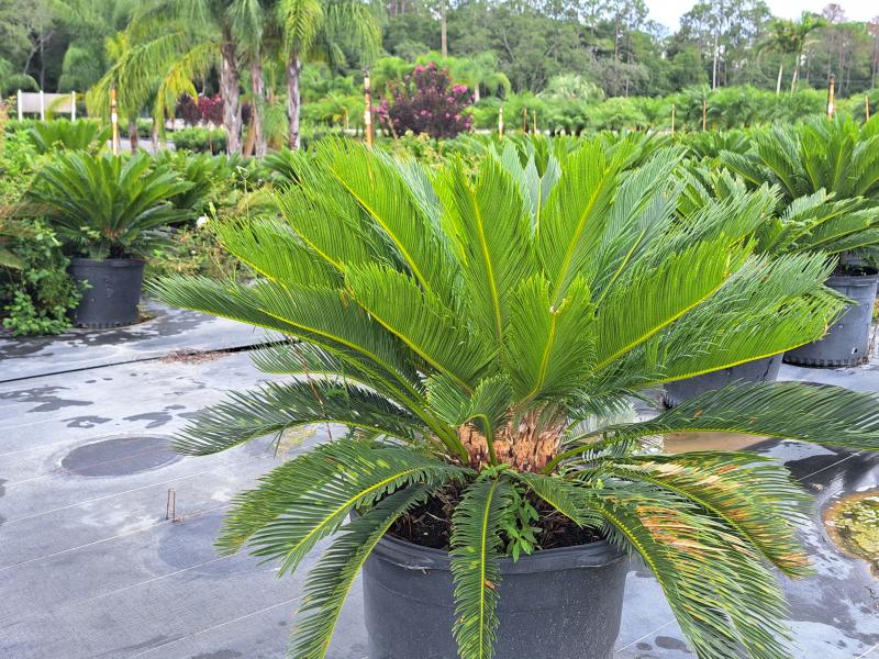 The Sago Palm is not actually a palm tree, but rather a cycad. It features a crown of dark green, feathery fronds that can reach up to three feet in length. These fronds give the plant a tropical and exotic look, making it a focal point in any setting.
